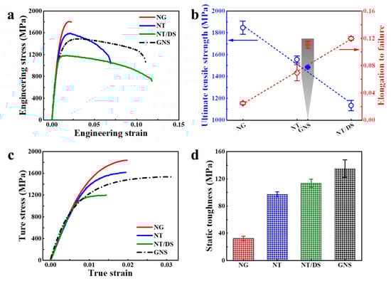 Comparisons between the GNS specimen and the isolated NG, NT, and NT/DS specimens: (a) engineering tensile stress-strain curves; (b) variation of ultimate tensile strength and elongation to failure; (c) true tensile stress-strain curves; (d) static toughness.