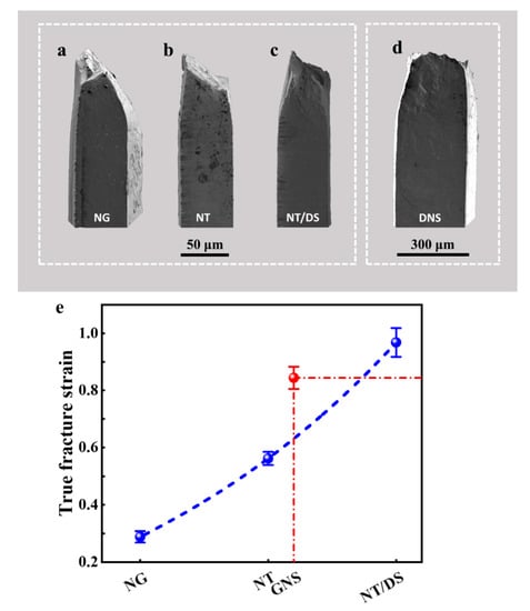 (a–d) Lateral morphology of the fractured NG, NT, NT/DS, and GNS specimens, respectively. (e) Variation of the true fracture strain of aforementioned specimens.