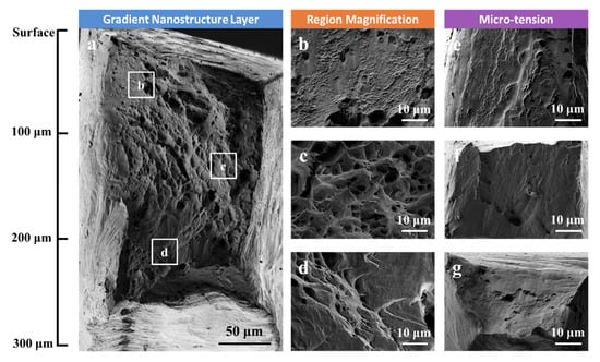 The microhardness tests were performed on the same plane (SD-ND plane) as that for microstructural characterizations. A series of indentations were conducted at various depths of the SMRT sample on a Qness Q10 A+ microhardness tester with a load of 50 g and a loading period of 10 s. The microhardness at each depth was averaged from at least three indentation tests. The uniaxial tensile properties of nanostructured layers at various depths were determined by means of a micro-tensile tester at a strain rate of 3 × 10−4 s−1. Figure 1b,c demonstrates the procedure for fabricating the micro tensile specimens. First, a protective layer of Ni was electrodeposited on the surface of the SMRT sample, and a slice of 500 μm in thickness was machined parallel to the TD-ND plane (Figure 1b). The slice was further mechanically ground to ~60 μm with SiC papers, and finished with a mirror-like surface by the same electropolishing process for SEM observations. Lastly, dog-bone-shaped micro tensile specimens with a gauge section of 250 μm in length, 60 μm in width, and 60 μm in thickness were machined on the longitudinal section with the loading direction parallel to the TD direction by means of a commercial femtosecond laser micromachining system (FemtoLAB, Workshop of Photonics), as shown in Figure 1c. The ultrashort pulse duration (~280 fs) and high pulse energy fluence (4.8 J/cm−2) of the laser made the material ionized before the heat energy dissipated into the surrounding material, thereby avoiding the thermal effect on microtensile specimens []. To ensure measurements of mechanical properties on representative microstructures at various depths, the micro tensile specimen was cut at three specific depths with gauge width covering regions of 0–60 μm, 100–160 μm, and 200–260 μm, respectively. Furthermore, microtensile specimens with gauge width covering 0–300 μm were also laser-machined.