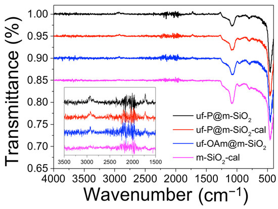 Fourier transform infrared (FTIR) spectra of uf-P@m-SiO2, uf-P@m-SiO2-cal, uf-OAm@m-SiO2, and m-SiO2-cal samples.