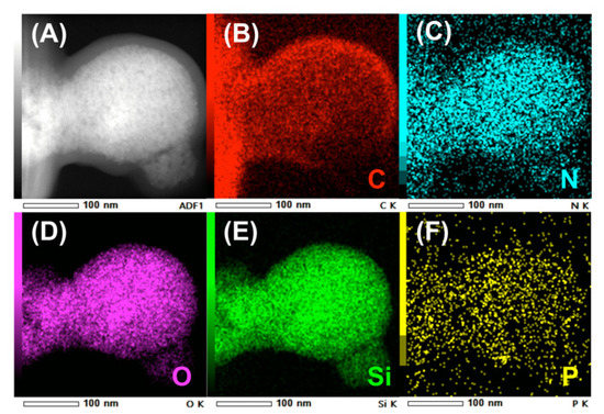 TEM elemental mapping of uf-P@m-SiO2. (A) the TEM image of uf-P@m-SiO2, (B) the C element mapping, (C) the N element mapping, (D) the O element mapping, (E) the Si element mapping (F) the P element mapping.