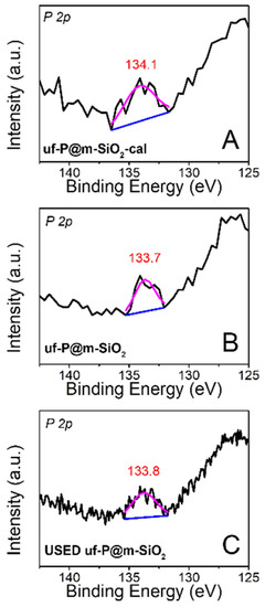 The X-ray photoelectron spectra (XPS) of uf-P@m-SiO2-cal (Figure 6A: fresh) and uf-P@m-SiO2 (Figure 6B: fresh; Figure 6C: used) were collected to identify the chemical state of P. The peak is located at ~134 eV for all samples, which can be attributed to the presence of phosphate species [26]. There is no peak at a binding energy of 130 eV, typical of elemental phosphorus or phosphorus pentoxide at 135.0–135.5 eV [26]. The XPS quantitative analysis of uf-P@m-SiO2 (Table S1) indicates the atomic concentration ratio of P/Si is about 0.4 at.%, which is consistent with the result from SEM-EDX (Table 2) and TEM-EDX data (Table S2). The atomic concentration ratio of P/Si and the P peaks (Figure 6) do not show obvious differences between uf-P@m-SiO2-cal and uf-P@m-SiO2 (Figure 6B: fresh; Figure 6C: used), while the C and N ratios in used uf-P@m-SiO2 are lower than the C and N ratio in the fresh uf-P@m-SiO2 sample. The latter is anticipated due to the reaction temperature and the slow decomposition of residual CTAB during the reaction.