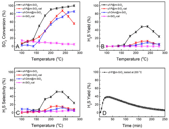 Curves of SO2 conversion (A), H2S yield (B), and H2S selectivity (C) obtained from uf-P@m-SiO2, uf-P@m-SiO2-cal, uf-OAm@m-SiO2, and m-SiO2-cal at the temperature of 100 °C to 280 °C. H2S yield of uf-P@m-SiO2 long-term test at 200 °C (D).