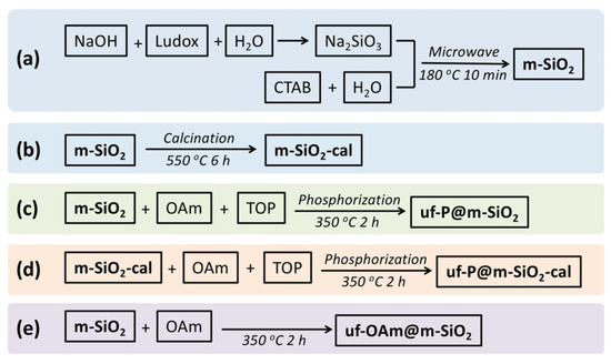 Synthetic routes indicating the preparation of the different catalysts of this study. (a) Microwave synthesis of m-SiO2 [21,22]. A 16 g amount of NaOH was dissolved in 400 mL H2O, then 94 mL Ludox (40 wt.%) was added to the above NaOH solution. This mixture was stirred at 40 °C in a sealed polypropylene bottle overnight until the preparation of a clear Na2SiO3 solution was achieved. A 1.0 g amount of CTAB and 35 mL H2O were mixed in a sealed polypropylene bottle, then the above solution was stirred slowly at 60 °C for 1 h to achieve a clear viscous solution. At the same time, 25 g of the above Na2SiO3 solution were stirred at 60 °C in a sealed polypropylene bottle for 1 h. Then, the CTAB solution was added to the Na2SiO3 solution. After 1 h of vigorous stirring at 60 °C, this mixture was removed into a 100 mL Teflon autoclave and placed in the microwave reactor (CEM MARS™ 6 Microwave Digestion and Extraction System), where a program of 5 min ramp heating to 180 °C and dwell time of 10 min at 180 °C was applied, followed by cooling to room temperature. To remove the excess of the surfactants, the solid was filtered on a Büchner funnel and washed with deionized water several times until there were no bubbles in the waste water. Then, the white solid was dried in an oven at 80 °C overnight to obtain an average of 1.5 g white powder m-SiO2. (b) Preparation of m-SiO2-cal [21,22]. The above-mentioned m-SiO2 was calcined in a tube furnace with the following stepwise process: the calcination program was set as 2 °C/min to ramp up from room temperature to 550 °C, and heating at 550 °C for 6 h, then cooled down in air. The obtained white powder was named m-SiO2-cal. (c) Preparation of uf-P@m-SiO2 [16,17]. In N2 atmosphere, 0.5 g m-SiO2 was first mixed with 10 mL OAm and 5 mL TOP in a three-necked flask. This mixture was under magnetic stirring for 10 min at 80 °C, then stirred at 350 °C for 2 h. These operations should be run carefully in the fume hood to avoid serious poisoning and damage to the skin and eyes caused by the TOP and its vapor. After cooling to room temperature, the powder was precipitated by centrifugation for 3 min at 4000 rpm, then washed with ethanol and hexane more than 3 times to remove the excess of the OAm and TOP on the surface of the powders. Finally, the resulting solid was dried in an oven at 80 °C overnight and named uf-P@m-SiO2. (d) Preparation of uf-P@m-SiO2-calIn N2 atmosphere. A 0.5 g amount of m-SiO2-cal was first mixed with 10 mL OAm and 5 mL TOP in a three-necked flask. The following procedures were the same as the preparation of uf-P@m-SiO2. (e) Preparation of uf-OAm@m-SiO2. In N2 atmosphere, 0.5 g m-SiO2 was first mixed with 10 mL OAm in a three-necked flask without any addition of TOP. The following procedures were the same as the preparation of uf-P@m-SiO2.