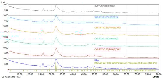 The XRD patterns of the studied terbium-doped hydroxyapatite and undoped HAp reveal the formation of a pure hexagonal HAp phase (according to ICDD PDF4+ card no 00-068-0738, Figure 2 [43], in agreement with the literature [44,45,46]. The XRD patterns of the studied samples indicate only the pure hexagonal HAp phase of the space group P63/m, along with all of the diffraction peaks in the HAp standard JCPDS database (PDF4+ card no 00-068-0738), such as: (002), (121), (112), (030), (022), (130), (222), (123) and (004).