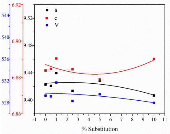 Unit cell parameters (a, c, V) vs. substitution degree for Ca10−xTbx(PO4)6(OH)2.