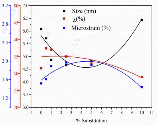 The crystallinity degree and crystallite size of the studied samples are shown in Table 2, and an illustrative variation of those parameters is presented in Figure 2. In all of the studied samples, the peak intensities decrease with increasing terbium ion doping concentration level, signifying an interference of terbium ions with the crystal structure of HAp.