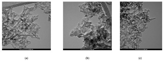 In Figure 7, TEM images of hydroxyapatite doped with terbium ion for x = 0.05 (Figure 7a), x = 0.25 (Figure 7b) and x = 1 (Figure 7c) are shown. The bright field TEM images show a rod-like morphology of the particles specific to hydroxyapatite.