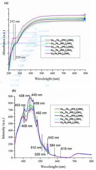 The UV-Vis spectra of terbium-doped hydroxyapatite powders from Figure 8a shows two shoulders at 242 nm and 259 nm. The intensity of band observed at 242 nm increases with increasing terbium content. No other bands are observed in UV-Vis absorption spectra of terbium-doped hydroxyapatite powders.