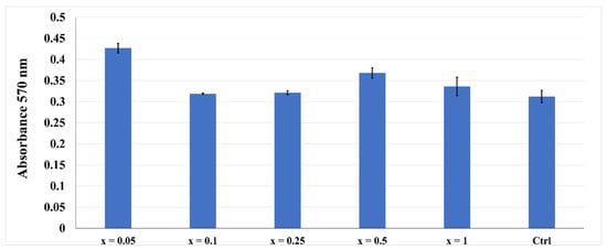 The biocompatibility of synthesized terbium-doped hydroxyapatite samples was estimated using MTT [3-(4,5-dimethylthiazolyl)-2,5-diphenyltetrazolium bromide] assay (Vybrant®MTT Cell Proliferation Assay Kit, Thermo Fischer Scientific, Waltham,, MA, USA). The human mesenchymal amniotic fluid stem cells (AFSC) were grown in DMEM medium (Sigma-Aldrich, Saint Luis, MO, USA) supplemented with 10% fetal bovine serum, 1% antibiotics (penicillin and streptomycin) (Sigma-Aldrich, Saint Luis, MO, USA), changed twice a week. The growth of AFSC cells took place in 96-well plates, with a seeding density of 3000 cells/well in the presence of Ca10−xTbx(PO4)6(OH)2 powders, for 72 h. Subsequently, 15 mL (12 mM) of MTT was added to the cells, followed by incubation at 37 °C for 4 h. A solution of 1 mg Sodium Dodecyl Sulphate in 10 mL HCl (0.01 M) was added and pipetted vigorously in order to solubilize the formed formazan crystals. A TECAN Infinite M200 spectrophotometer (Männedorf, Switzerland) at 570 nm was used to evaluate the optical density (OD) of solubilized formazan, after 1 h.