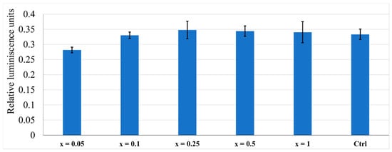 The oxidative stress assessment was performed using the GSH-Glo Glutathione Assay kit (Promega, WI, USA). AFSC was seeded at a density of 3000 cells in 300 µL of Dulbecco’s Modified Eagle’s medium (DMEM) supplemented with 10% fetal bovine serum and 1% antibiotics (penicillin, streptomycin/neomycin) in 96-well plates. After 24 h of seeding, cells were treated with Ca10−xTbx(PO4)6(OH)2 and then incubated for 72 h. To this solution was added 100 µL 1X GSH-Glo Reagent, followed by incubation at 37 °C for 30 min. Subsequently, 100 µL Luciferin Detection Reagent was added and incubated at 37 °C for an additional time of 15 min. Afterwards, the medium from the wells was well homogenized and then the plate was read on the luminometer (Microplate Luminometer Centro LB 960, Berthold, Germany) [32,33,34].