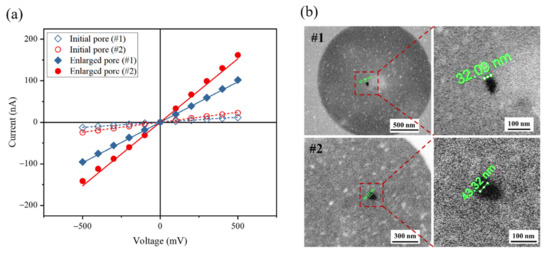 In order to obtain larger-sized pores with controllable diameters, bipolar square pulses were employed after pore creation to enlarge the size of plasma-treated pores. By applying a 3 V transmembrane potential, pore diameter could enlarge to >30 nm within 10 min. Figure 3a shows the I–V curves of two nanopores before and after enlargement breakdown. Based on Equation (1), it was estimated that: the initial size of pore #1 was 9 nm, that of pore #2 was 13.3 nm, the final size of pore #1 was 32.9 nm, and that of pore #2 was 45.5 nm. Previous studies have demonstrated the formation of multiple pores during the enlargement process [50,51,52]. In our study, there was a thinned region in the SiNx membrane where the electric field was stronger and additional pores may have been created [41]. However, scanning electron microscope (SEM) images (Figure 3b) indicate that there was only a single nanopore in the thinned area after enlargement breakdown, even though the 3 V transmembrane potential was able to break down the plasma-treated membrane. Furthermore, the measured pore diameters were comparable to the calculated value, which further confirmed that only a single pore existed on the SiNx membrane. There are two reasons why no other pores were formed. First, after a nanopore formed, the electric field concentrated in the pore, which caused the electric field strength to reduce in other regions of the membrane. Second, in our work, the expansion electric field strength was 0.15 V/nm, which is less than the strength of the fields used in previous studies that resulted in multiple pore formation [41,50,52].