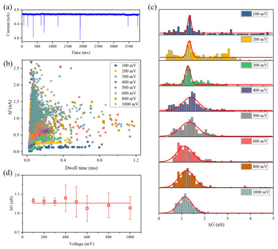 (a) Ionic current trace of the translocation of λ-DNA molecules through an 8 nm-diameter nanopore in 1 M KCl with an applied voltage of 200 mV; (b) scatter plot of dwell time versus current blockade at various voltages, ranging from 100 to 1000 mV; (c) histograms of ∆G for λ-DNA molecule translocation through the nanopore. Solid red lines represent the fit of a Gaussian distribution to the experimental data, from which we extracted the mean ∆G; (d) mean ∆G of translocation events with various voltages.