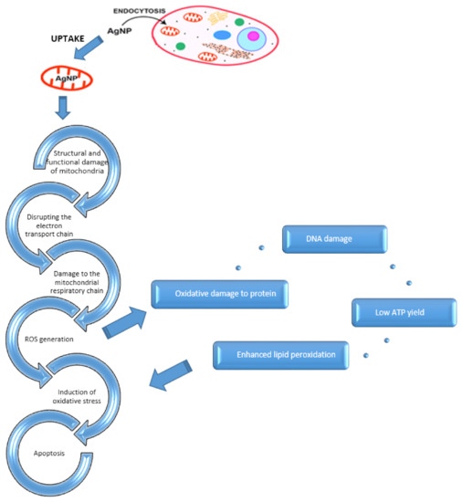 An increase in the toxicity of nanoparticles associated with the production of reactive oxygen species has also been described [76,77,79,80,83,91]. After infiltrating the cell, Ag nanoparticles degrade intracellularly, releasing Ag+ ions that impair mitochondrial function. ROS, accumulating as byproducts of the electron transport chain, cause mitochondrial damage and impairment of function, depolarization of the mitochondrial membrane, damage to mtDNA (mitochondrial DNA), and peroxidation of lipids and protein elements, eventually leading to apoptosis (Figure 1) [76,77,78,79,80,81,83,84,85,92].