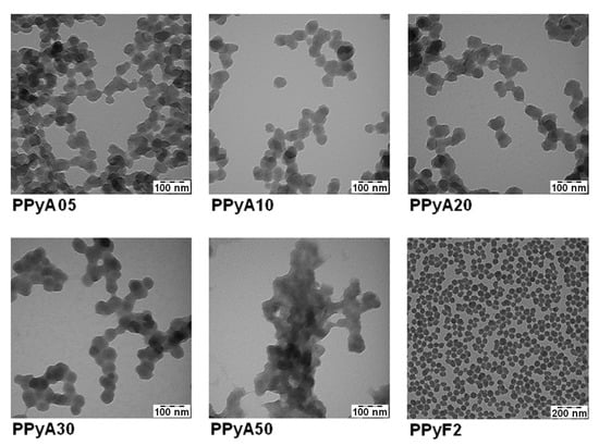Nanoparticles labeled as PPyA05, PPyA10, PPyA20, PPyA30, and PPyA50 were prepared by oxidation of Py monomer (300 mg, 4.42 mmol) with different molar ratios of APS (5 mL solution, nPy:nAPS, 1:0.5, 1:1, 1:2, 1:3 and 1:5 respectively) in the presence of 1 wt.% PVP (65 mL) solution. Preparation was performed in the 100 mL septum-sealed flasks at room temperature [36].