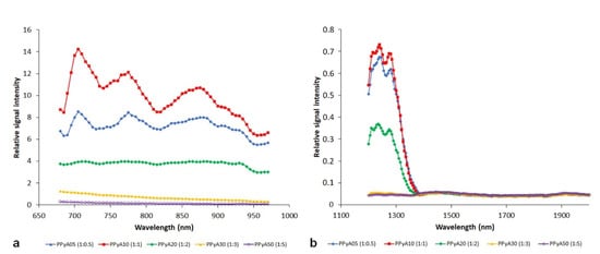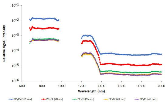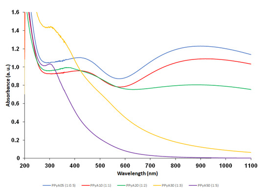 Photoacoustic spectra of the PPyA nanoparticles prepared by polymerization at different APS molar ratios are shown in Figure 3. Samples with a lower ratio of the oxidant (PPy05, PPy10, PPy20) revealed a substantially higher signal compared to the samples with a higher ratio of the oxidant (PPy30, PPy50). The effect was noticeable in both wavelength ranges (680–970 nm, 1200–2000 nm). Interestingly, the effect of the used APS amount is not linear, and the highest signal was obtained at Py:APS ratio 1:1.