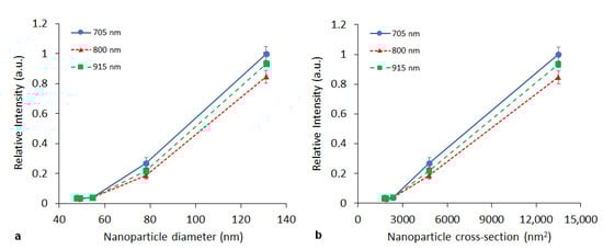 Dependence of the relative PA signal intensity (per one nanoparticle) on the nanoparticle diameter (a) or cross-sectional area (b) measured at the same concentration (3 mg/mL) at selected wavelengths (705, 800, 915 nm).