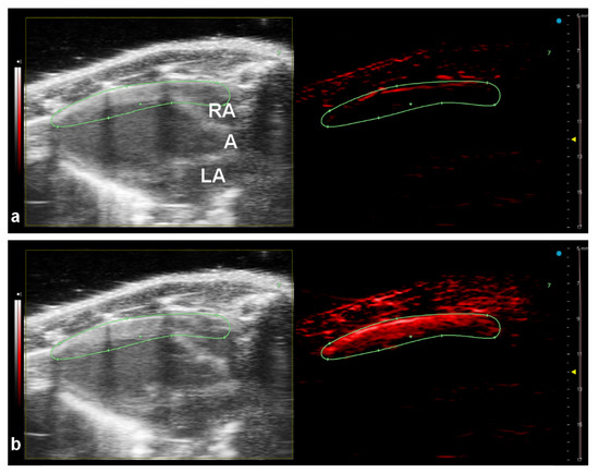 Multimodal US-PA imaging of the mouse heart in its long axis in B-Mode (left panels) and PA-Mode (right panels) before intravenous PPyF4 nanoparticle administration (a) and 5 s after bolus injection (180 µL) (b). The PA detection was at single wavelength mode obtained at 800 nm. RA—right atrium, A—aorta, LA—left atrium.