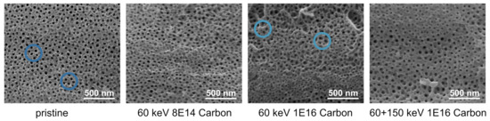 Figure 2. SEM images of NT arrays reveal surface relaxation effects upon ion bombardment with different C ion energies and fluences. Characteristic regions are highlighted with blue circles.
