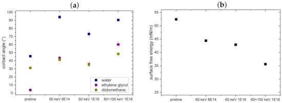 In addition, we performed contact angle measurements to obtain the SFE. As depicted in Figure 7, the contact angles increase with increasing ion fluence, while the SFE decreases, again indicating a surface relaxation process [19], as the chemical composition is mainly constant with the implanted C concentration still at the level of doping only.