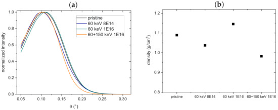 To determine the effect of the applied ion fluences on the density of the material, we performed X-ray reflectivity (XRR) measurements (Cu K α 1 -line, Seifert XRD 3003 PTS, Richard Seifert & Co GmbH & Co KG, Ahrensburg, Germany). The spectra were normalized and fitted with GenX software, version 2.4.10 [24].