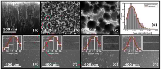 Further images show the SiNHs’ active area decorated with four types of high aspect-ratio MeNWs. The insets of (Figure 1e–h) correspond to the following metallic nanowires: AgNWs, AuNWs, NiNWs and PtNWs, respectively. In addition, a statistical analysis using ImageJ software [37] was performed to obtain the mean value of the nanowires’ length and the resulting distributions are presented as insets in Figure 1e–h. It was found that the mean value of the length for all nanowires was 12 μm with a standard deviation (SD) of 2 μm. The mean tip diameter was found to be roughly 207 nm for all nanowires. Further investigation of the SEM micrographs using the binarized image revealed that roughly 6% of the entire SiNHs’ surface represented the total area covered with MeNWs, regardless of the type of metallic nanowire. Given the proportion of nanowires’ coating compared to the photodetector active area, the inherent variations of the contact quality on the full length on the nanowires could be neglected. The deposition parameters, including deposition time and MeNWs concentration, were well controlled and the distribution of MeNWs as single and bundled nanowires could be distinguished on SiNHs’ substrate. It is difficult to completely eliminate the agglomeration of nanowires due to the level of interaction between them, which is influenced by many factors such as the magnetic properties (e.g., Ni) or the specific chemical environment during the fabrication phase. Another factor could be related to the surface tension occurring during solvent evaporation in the solution-based deposition process [38].