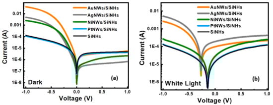 (a) The semilogarithmic plots of the forward and reverse bias current-voltage characteristics of the photodetector based on SiNHs and AgNWs/SiNHs, AuNWs/SiNHs, NiNWs/SiNHs and PtNWs/SiNHs heterojunctions under dark condition and (b) under white light illumination.