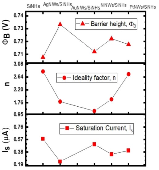 The dark I-V characteristics of the forward bias region were further used to evaluate the main electrical parameters, such as Schottky barrier height (SBH–ΦB), ideality factor (n) and saturation current (Is). Based on the thermionic emission law [43], the abovementioned electrical parameters calculated from forward current-voltage characteristics are plotted in Figure 4. The SBH shows close values ranging from 0.709 (SiNHs) to 0.732 V (AgNWs/SiNHs). This fact is strongly supported by the dark I-V characteristics (Figure 3) which have a similar trend at low-voltage bias domain. The deviation from the ideality is given by n, a factor that offers information about the rectifying performances of the Schottky diode. In this case, n starts from a value of 2.83 for the SiNHs reference and decreases towards the unity after the deposition of the MeNWs, reaching its lowest value n ~1.48 in the case of the AuNWs/SiNHs sample. This is in strong correlation with the I-V characteristics, where the AuNWs/SiNHs sample shows a significant variation of the forward current. The improvements of electrical parameters in dark conditions can be attributed to surface passivation of the SiNHs leading to an electrically homogenous active area. By directly contacting the Si, MeNWs might operate as trapping centers for the minority carriers, thus minimizing recombination loss. The saturation current was also determined in order to estimate the dark current for the fabricated samples and is related to the number of charges that overcome the barrier under reverse bias. As one can see in Figure 4, the saturation current varied between 0.581 µA (reference sample) up to 0.237 µA (AgNWs/SiNHs sample), showing a decrease by more than half in the dark current when the AgNWs were used. This result is also in strong correlation with the reverse I-V characteristics presented in Figure 3, where we can easily observe a dark current suppression for the AgNWs/SiNHs sample.