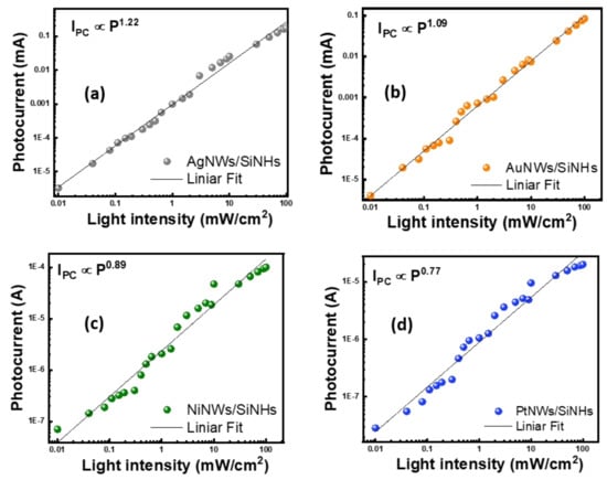 Next, the photoresponse of the devices based on MeNWs/SiNHs was measured under zero bias conditions by applying different optical powers varying from 0.01 to 100 mW cm −2 (Figure 5a–d). The photocurrent response showed a strong intensity-dependent behavior with a good linearity from lowest to highest power region. The dependence was fitted by a power law (IPC ∝ Pθ), where P is the light power and θ represents its exponent correlated to the photoresponse, with relatively large exponent values varying from 0.77 for PtNWs/SiNHs to 1.22 for AgNWs/SiNHs, whereas the greater than 1 value for the exponent is associated with dynamic plasmonic effects. In the framework of Rose theory [44], such close to integer values reveal the photoresponse is mostly proportional to the photogenerated carriers with a very low limitation caused by defect states or trapping centers. The results indicate MeNWs/SiNHs-based devices are able to operate in self-bias mode with a broad linear characteristic of the photoresponse, which is suitable for a variety of visible photodetection applications.