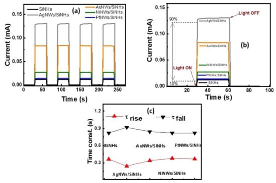 Furthermore, transient photocurrents (Figure 6a) were measured at zero bias under 100 mW cm−2 illumination, alternatively turned on and off in order to demonstrate the stability of the photocurrent responses. The photocurrent response of the bare and MeNWs-modified SiNHs photodetectors was repeated for many on/off cycles and exhibited a retention of more than 90% of the initial WL illumination photoresponse after 100 cycles, which demonstrates a good operation stability. The stability of the transient photoresponse on/off characteristics of the reference device was not altered by the surface modification of SiNHs with metallic nanowires. Two time constants were estimated, the rise time (τr), which is the time taken for the photocurrent to rise from 10% to 90% of the saturation value, and the fall time (τf), which is the time taken for the photocurrent to fall from 10% to 90% of the saturation value, as plotted in Figure 6b. The AgNWs/SiNHs device showed the fastest rise time of τr ~ 244 ms and the longest fall time of τf ~ 918 ms, whereas for the AuNWs/SiNHs device the rise time and the fall time were τr ~339 ms and τf of ~ 843 ms, respectively (Figure 6c). The time constants are strongly influenced by the lifetimes of plasmon-induced charge carriers injected at the Me/Si interface. On the other hand, NiNWs and PtNWs-based devices demonstrated very small variations of rise time and fall time compared to the bare SiNHs reference.