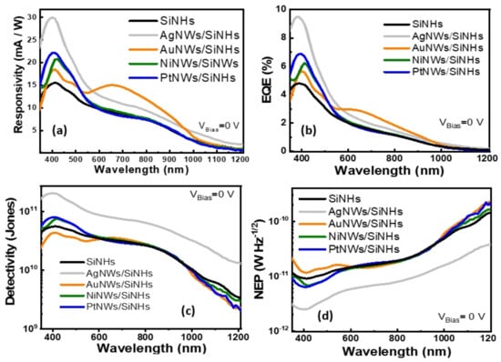 Figure 7a–d shows responsivity (R), external quantum efficiency (EQE), detectivity (D), and the noise equivalent power (NEP) plotted as a function of illumination wavelength. They represent important figure of merit parameters to evaluate and compare the performance of the self-biased MeNWs/SiNHs-based photodetectors.