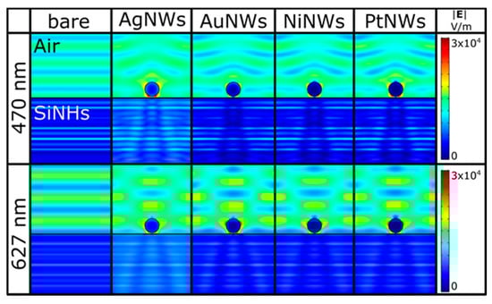 Electric field distributions around metallic nanowires on the SiNHs surface owing to the localized surface plasmon resonance (LSPR) response obtained at 470 nm and 627 nm illumination. For comparison, the bare SiNHs surface is also displayed in the first column.