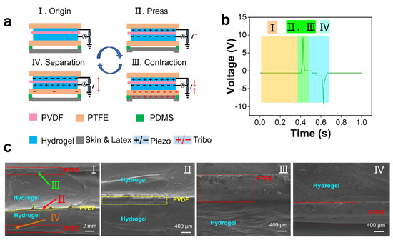 Figure 2 shows the coupling mechanism of TENG and PENG. TENG and PENG use a common electrode. The TENG system adopts a single electrode mode. The coupling mechanism can be divided into four sections. When the athlete is in a static state, the PTSS is in a free state with no external force and no electrical output (State I and Figure 2(bI)). When an external force is applied to the PTSS, the deformation happens on the PENG firstly, and the piezoelectric signal is produced (State II and Figure 2(bII)) with the external force increasing continuously. The skin/latex contacts the PTFE, the skin/latex tends to lose electrons, while the PTFE tends to acquire electrons, electrons transfer from the skin to the PTFE. The negative side of the PVDF and negative layer of TENG share the same electrode. The contact electrification and piezoelectricity occur simultaneously. Therefore, the electrons of the PENG and TENG move in the opposite direction on the circuit (State III and Figure 2(bIII)). When the external force disappears, the electrons flow back. The electrons of the PTFE flow to the ground. Then, the electrons of PENG and TENG move on the circuit in opposite directions again (State IV and Figure 2(bIV)). This unique working mechanism can be well applied to sports. Many sports are periodic, thus, many motion structures can be directly coupled with this mechanism in sports. Therefore, PTSS can be applied to human motion monitoring perfectly. Figure 2c shows the SEM (HITACHI S-4800) image of PENG. The Figure 2(cI) shows the side-view SEM image of the whole device. The PTSS is packaged by the PTFE film. Figure 2(cII–cIV) are the enlarged view of Figure 2(cI). There is no gap between the hydrogel and the PVDF layer. Hence, the PENG unit can hardly be influenced by the triboelectric signal.