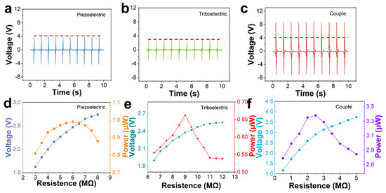 In this study, the outputting voltage is the major factor in the monitoring process. We injected water mist into the airtight box and the humidity achieved 100%. Figure S1 shows the cross-sectional microscopic image of the PTSS and three views of the device. It can be clearly seen that there is no air gap in the PENG unit, which can avoid the influence of the triboelectric effect between the hydrogel and the PVDF. The device is packaged by Dow Corning 3140 RTV. Therefore, the hydrogel cannot dehydrate in a short time, as this improves the stability and extends its service life. A stepper motor was used to test the outputting voltage of PENG, TENG, and PTSS at the 100% RH environment (Figure S2) and air, respectively. The average outputting voltage of PENG, TENG, and PTSS was 3.96 V, 3.08 V, and 8.6 V, respectively in Figure 3a–c. Figure S3 shows the data measured by PENG, TENG, and PTSS under the air condition and tested force, no deformation happened to them. We applied a tiny force to them; the applied force was 15 N. It is evident that PENG and TENG can be coupled together. Compared with PENG and TENG, the PTSS has an excellent sensing performance. Some movements cannot be detected by a single device. TENG cannot monitor the twist movement clearly. The outputting and response of PENG are low. The PTSS combines the merits of TENG and PENG. It can ensure a high output and accurate detection under complicated conditions such as twisting and bending. In addition, PTSS can increase the range of movement monitoring. We tested the 360° wrist rotation by PENG, TENG and PTSS in the Figure S4. Compared to single PENG and TENG, the PTSS can monitor more detailed signals. It is a device that can monitor various movement states. It can help the coach to better analyze the signal. The coach can observe clearer signals in the monitoring process. Figure 3d–f shows the power and outputting voltage of the PENG unit, the TENG unit, and the PTSS at different load resistances. As the resistance increases, the outputting voltage also increases. When the load resistances are 2.5 MΩ, 6 MΩ, and 9 MΩ, the power of PTSS, TENG, and PENG reaches the maximum. Therefore, the inherent resistance of PTSS, TENG, and PENG are 2 MΩ, 6 MΩ, and 9 MΩ, respectively.
