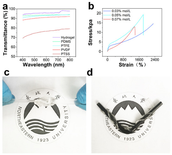 Physical properties of hydrogel (a) Transparency of each part of the PTSS. (b) Stress-strain curve of different APS ratios of hydrogel. (c,d) Scene of stretching hydrogel in any shapes.