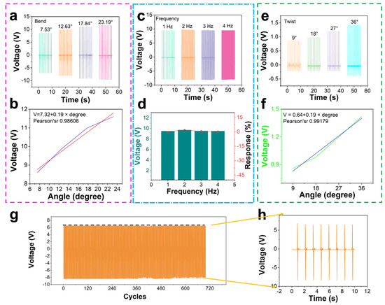 The performance test of PTSS. (a) Outputting voltage of PTSS at different bend angles in 100% RH. (b) The linear relation of angles and voltages. (c,d) Outputting voltage and response of PTSS at different frequencies in 100% RH. (e) Outputting voltage of PTSS at different twist angles in 100% RH. (f) Linear relation of twist angles and voltages. (g) Durability test of PTSS. (h) The detail of durability.