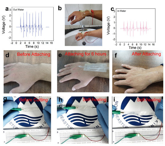 Scenes of waterproof, biocompatibility, and self-healing. (a–c) Test of waterproof ability. (d–f) Test of biocompatibility. (g–i) Self-healing property of hydrogel.