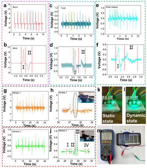 The technical motions of diving are difficult and highly ornamental. The referees score for the athletes’ performance, including their handstands or upright preparation postures, aerial skills, the number of somersaults, and the spray size at the moment of entering the water. At present, the water rip entry motion of the world’s top athletes is to cross their hands to form a square shape, and the water spray formed by this technical motion is small. In order to better monitor the athletes’ technique of rip entry motion, we must monitor their wrist motions firstly, which are wrist bending, twisting, and rotation. The voltage generated by a series of motions is shown in Figure 7a,b. Figure 7a,b shows the outputting voltage and details of wrist bending motion, and its specific motions are shown in Movie S5. The bending of the athlete’s wrist produces an upper wave peak I, and the straightening of the athlete’s wrist produces a lower wave peak II. The reason why wave peak I is significantly greater than wave peak II is that the speed and strength of the bending motion are greater than those of the straightening motion. This kind of motion monitoring is also suitable for shotput wrist motion monitoring. Figure 7c,d shows twist motions and details of the twist, its specific motions are shown in Movie S6. The rotation motion of the wrist includes internal rotation and external rotation. In Figure 7d, part I is the internal rotation motion and part II is the external rotation motion. As shown in Figure 7d, wave peak I is significantly larger than wave peak II because the speed and strength of the internal rotation motion are greater than those of the external rotation motion. This kind of motion monitoring is also applicable to the wrist-twisting and pulling motion monitoring of table tennis. We believe that it will be an important research direction to apply this monitoring method to the stability monitoring of athletes’ rotation technical motion. Figure 7e,f shows the rotation motion and details of the wrist. Part I of Figure 7f is the internal rotation motion and part II is the external rotation motion. Wave peak I is significantly greater than wave peak II, because the speed and strength of internal rotation motion are greater than those of external rotation motion (Movie S7). This kind of motion monitoring is also applicable to the wrist motion monitoring of diving athletes. Based on the limitations of this research, our group cannot quantitatively analyze its speed and strength, which is also a direction for our next study. Figure 7g–j show the motions and details of two athletes simulating 301C diving on land (Movies S8 and S9). Figure 7h,j show signal waveforms of two athletes in one motion cycle. Overall, the waveforms of the two athletes are similar, but there are also some differences. Figure 7j shows a 301C motion with a knee hugging reverse somersault for half a cycle and a difficulty coefficient of 1.8. 301C motion is divided into four stages. Stage I is the round body motion of holding the knees with both hands, and a certain angle of the wrist. As shown in Figure 7j, Athlete 2 has a large and complete knee hugging motion in stage I. Stage II is a tight state in which the arms are quickly extended from the knee hugging state to both sides of the body. At this time, the wrist experiences bending from holding the knee to straightening. Stage III is the water entry stage. The arms quickly move from both sides of the body to the top of the head, and the hands form a square shape. At this time, the wrist needs to rotate inward from the straight state to the square state. After entering the water, the wrist naturally returns to the normal state. The operation signal at this time and Figure 7f are the voltage generated by the same operation. Stage IV is the stage of re-embracing the knee, and the motion is the same as that in stage I. In addition, we have also monitored the twisting and pulling motion of table tennis (Movie S10), and the sensing signal is shown in Figure S11. It shows that PTSS can monitor multiple motions. Figure 7k,l are a schematic diagram of the wireless Bluetooth transmission system. The sensor is connected to a signal transmitting module. When the transmitting module receives the signal, it transmits the signal to the receiving module, and the LEDs are controlled by it. When the athlete is in a static state, there is no signal and Bluetooth only lights up one light, corresponding to the red circle state in Figure 7h. In contrast, when the athlete is in a dynamic state, the signal is produced and Bluetooth lights up three lights, corresponding to the black circle state in Figure 7h. The encapsulated device connects with the Bluetooth module. In the Bluetooth communication test, we only put the PTSS into the water. In this study, the main aim was to design a sensor which can be used to monitor the human movement underwater. The experiment showed that PTSS can monitor the bending and twist signal underwater. We have encapsulated the device and Bluetooth together. It will be introduced in subsequent work. Figure 7m shows the real-time wireless Bluetooth waveform display system (Movie S11). In the process of training, if we can collect information through mobile phones, it will be conducive to more direct monitoring of athletes’ training status. Therefore, we built a wireless monitoring system composed of a hybrid nano-generator, digital multimeter with Bluetooth module and collection to demonstrate the possibility of human motion monitoring (Figure 7m). Wearable mixed-mode sensors can collect and process human motion data through a digital multimeter, and a mobile app can monitor the voltage in real-time. We have proved that it can be applied to human motion monitoring through a simple impact test. Meanwhile, it can also charge capacitor. Figure S12 shows curves of the PTSS charges capacitors. The PTSS charges are 0.1 μF, 0.22 μF, and 0.47 μF and the