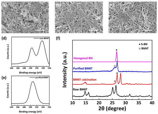 Provided boron nitride nanotubes (BNNTs) contain impurities such as amorphous boron, hexagonal boron nitride (h−BN), and amorphous boron nitride (BN) particles [29]. The purification method of BNNT was referred to in previously published papers [30]. The detailed purification process is described in the supplementary information. The scanning electron microscopy (SEM) images of the sediments show that the particles are removed, and the purified BNNTs were obtained (Figure 1a–c). X-ray photoelectron spectroscopy (XPS) spectra and X-ray diffraction (XRD) patterns were analyzed to confirm that the BNNTs were purified. In the XPS spectra, the ratio of boron to nitrogen is about 3 at B 1s peak in XPS spectra. However, after purification, the ratio of boron to nitrogen became 1.2:1, and the high-resolution B 1s XPS of p−BNNT shows only the peak of B–N binding at 191 eV (Figure 1d,e). In the XRD graph, all the amorphous boron peaks have disappeared (Figure 1f). In the XRD graph, all the amorphous boron peaks disappeared after purification. It is important to compare the XRD patterns of BNNT after calcination and purification. One crystalline impurity in BNNT is h−BN, which has a sharp peak at 26.7°. BNNT, which is not crystalline, has a broad peak at 25.8°. The BNNTs after calcination contain a large amount of h−BN, as seen in the strong h−BN peak at 26.7°. After calcination, the broad peak at 25.8° is not evident because of the intensity of the h−BN peak. However, after purification, the h−BN peak is significantly reduced such that the BNNT peak is clearly observed. This indicates the purification method effectively removes particle impurities such as h−BN.