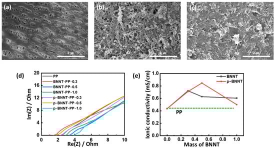 SEM images of (a) PP separator (Celgard 2400), (b) BNNT separator, and (c) p−BNNT separator; (d) EIS of separators with Al symmetric electrode cell; (e) ionic conductivity of separators.