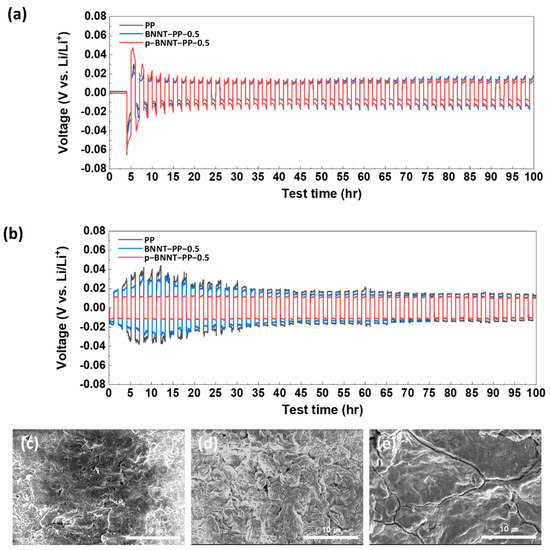 Lithium stripping/plating experiments with PP, BNNT, and p−BNNT loaded separator at (a) 0.35 mA/cm2 and (b) 1 mA/cm2; SEM images of lithium metal after finishing lithium stripping/plating measurement using (c) PP, (d) BNNT−PP−0.5, and (e) p−BNNT−PP−0.5.