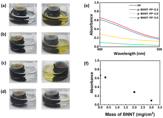 Diffusion test during 6 h with (a) PP, (b) p−BNNT−PP−0.3, (c) p−BNNT−PP−2.0, and (d) p−BNNT−PP−3.0 for 6 h from left to right; (e) UV-vis spectra of diffused solution; (f) quantification graph of UV-vis spectra at 400 nm.