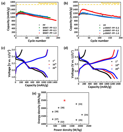 Cycle stability of LSBs with (a) BNNT−PP separators, (b) p−BNNT−PP separators; Charge/Discharge profile of LSBs of (c) PP and (d) p−BNNT−PP−1.0 separator at 1st, 10th, 20th cycle. Sulfur loading mass is 2 mgS/cm2 and working voltage is 1.8–2.6 V vs. Li/Li+ at 0.3 C-rate; (e) Ragone plot of LSBs equipped with functional separators so far reported including p−BNNT−PP−1.0 at 100th cycles. These values solely consider the mass of active materials.