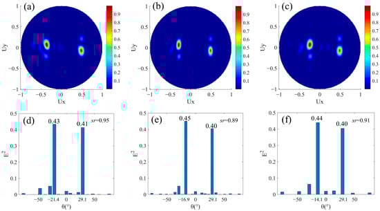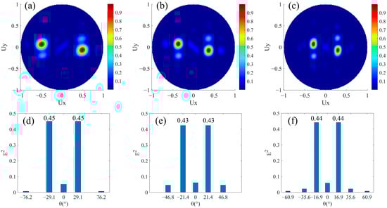 Firstly, beam splitters with the same split angle and energy were designed. There is no phase buffer in a super cell, that is M = 0 in Figure 1a. Additionally, Nl = Nr, while the alignment directions of the nanorods are opposite. Therefore, the same number of nanorods in two rows guarantees that the magnitudes of the phase gradients are equal, so the magnitudes of the split angles are equal. In addition, the areas of the two regions with opposite phase gradients are the same, so the incident beam can be split into two beams with equal energy. We designed three groups of structures for Nl = Nr = 3, Nl = Nr = 4, and Nl = Nr = 5, respectively. In the three structures, the nanorods are periodically arranged along x direction, and the numbers of them covering a 0–2π phase period between upper and lower rows are the same. The phase increment of adjacent nanorods Δφ along the +x direction is −2π/Nl in the upper row, and it is 2π/Nr in the lower row. The far-field projections of their normalized transmission fields are shown in Figure 2a–c, respectively, where the abscissa is related to the split angle in the xoz plane. We can see that the transmitted light is split into two opposite directions close to the xoz plane. The split plane we considered is the xoz plane, and the theoretical value of Uy is 0. However, it can be seen that there is also a weak split phenomenon in the y direction due to the inevitable phase gradient in the y direction, which is why the two split transmitted beams are not completely in the xoz plane. We regarded the transmitted field as the result of diffraction and calculated the normalized field intensities corresponding to the main split angles through the grating diffraction order method, as shown in Figure 2d–f. The split angles obtained by the simulation in Figure 2d–f are consistent with the angles , , and , which were calculated according to Equation (2). We can intuitively conclude that the two split beams in the xoz plane have the equal magnitudes of angles and equal intensities in two opposite directions. It is worth noting that, as shown in Figure 2d–f, the number of the diffraction order will increase with the increase of Px. The secondary diffraction orders will occupy a part of the energy of the transmitted light, resulting in an increase in stray light.