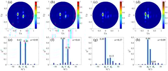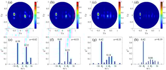 Finally, we designed beam splitters with different split angles and different split energies. The difference from the design in Section 3.3 is that the magnitudes of phase gradients of the upper and lower areas are also different after the phase buffer is introduced in one of the areas. In the design of Figure 1a, Nl = Nr, and the phase buffer composed by M columns of nanorods is added in the area for rightward beam splitting. The period of the super cell in the x direction is the least common multiple of Nl × p and (Nr + M) × p. In this case, even if Nl and Nr are equal, while the magnitudes of average phase gradients of leftward and rightward beam splitting areas are not equal due to the introduction of the phase buffer, resulting in different magnitudes of split angles. Additionally, the presence of the phase buffer will weaken the light intensity of the rightward refracted beam so that the split energies are different. We have designed four structures with Nl = 3 and M as 1, 2, 3, and 4, respectively. Here, it can be seen as adding M nanorods all with a 2π phase delay to the low row of the design in Section 3.1 with Nl = Nr =3. In the upper row, the phase increment of adjacent nanorods Δφ along the +x direction is fixed at −2π/3. In the lower row, there are three nanorods with adjacent 2π/3 phase increments and M nanorods all with 2π phase delays in an arranged cycle. The corresponding far-field projection intensity distributions are shown in Figure 5a–d, respectively. Similar to the results in Figure 4, a good leftward beam splitting is maintained when M is a different value, while the energy of the rightward beam splitting decreases as M increases. Further, the intensity distributions corresponding to the main angles are shown in Figure 5e–h. When M is from one to four, (θl, θr) are (−29.1°, 21.4°), (−29.1°, 16.9°), (−29.1°, 14.1°), (−29.1°, 12.0°), respectively. The leftward split angle θl remains unchanged, while the rightward split angle θr gradually decreases due to the decrease of the magnitude of the average phase gradient. Figure 5e–h, the light intensity at θl remains almost unchanged, while the at θr gradually decreases, so the split ratio sr also decreases. It can be noticed that in Figure 5f–h is significantly larger than that in Figure 5e, and it is due to the superposition of stray light, which is the same as that in Section 3.3. Therefore, beam splitters with different split angles and energies are realized, and the split ratio can be changed in the range of about 0.2–0.8 by controlling the number of N and M.