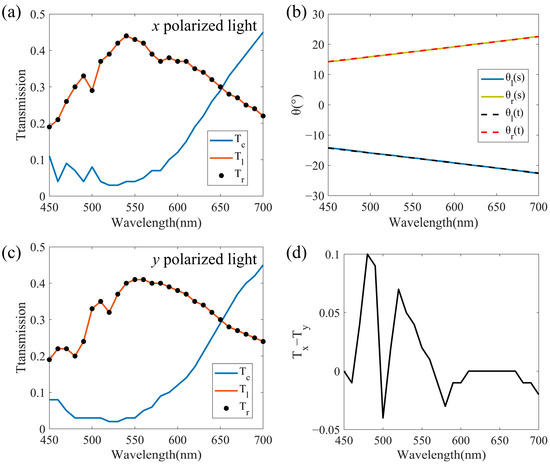 We continued to explore the performance of the proposed beam splitter in waveband and polarization dependence. The structure designed with Nl = Nr = 5 in Section 3.1 is used for wavelength scanning from 450 nm to 700 nm. Figure 6a is the relationship between the transmission and wavelength for the x polarized light incidence, where Tl and Tr are the intensities of the leftward and rightward split beams respectively, and Tc is the intensity of the vertical transmitted beam. We can see that between 480–600 nm, the Tl and Tr are equal and higher than 0.3, while Tc is lower than 0.1, which shows that most of the light is refracted in the two desired directions. So, the beam splitter we designed has a certain broadband characteristic. Figure 6b shows the split angles obtained by simulation (solid line) and theoretical calculation (dashed line) at the corresponding wavelength. The magnitude of split angles θl and θr are always equal and positively correlated with the wavelength, which is caused by the dispersion characteristic of the metasurface. The agreement between the simulation and theoretical results proves that the generalized Snell’s law can be used to explain the metasurface we designed. In Figure 6a, Tl and Tr begin to decrease, while Tc begins to increase when the wavelength is greater than 600 nm. This is because longer wavelength corresponds to larger split angle, and the realization of large split angle will come at the cost of split energy as we discussed in Section 3.2. On the contrary, the vertical transmittance is high at longer wavelength. In order to analyze the polarization dependence of the proposed beam splitter, Tl, Tr, and Tc in 450–700 nm for y polarized light incidence are obtained as shown in Figure 6c. We can see that the beam splitter can still maintain a beam splitting with the ratio of 1:1 across the entire waveband. The change trends of the transmittance of the split beams with wavelengths are almost the same as that of the x polarized incident in Figure 6a. To further measure the polarization dependence, we calculated the difference of Tl or Tr between the x and y polarized lights incidences, as shown in Figure 6d. The magnitude of the difference is in the range of 0.1, indicating that the proposed beam splitter is weakly dependent on polarization. It is worth noting that although a single nanorod has a high rotational symmetry, the arrangement of the metasurface is still anisotropic in the x and y directions, causing the above-mentioned slight difference. In addition, the Tl and Tr in Figure 6c are generally slightly smaller than those in Figure 6a, which may be due to the fact that the incidence of y polarized light will enhance the diffraction in the y direction, while the light intensity we calculated is the region close to the x axis, and the light intensity far from the x axis will be ignored. However, diffraction behavior weakens at longer wavelength, so the difference between Tx and Ty in Figure 6d decreases between 600–700 nm.