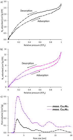 N2 isotherms for (a) Cu20Ni80 and (b) Cu45Ni55 surface-mesostructured films; (c) resulting pore size distribution for both compositions.