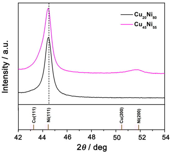 Figure 7 shows the XRD patterns of Cu20Ni80 and Cu45Ni55 surface-mesostructured films between 42° and 54°. In this region, two peaks at ca. 44° and one at 51–52° were observed, located between the (111) and (200) peaks of face-centered cubic (fcc) crystal structures of Ni and Cu. This indicates that the samples crystallized in the fcc structure (space group Fm3m). The position of the (111) reflection for Cu20Ni80 shifted toward lower angles with respect to that of Cu45Ni55, from 44.8° to 44.3° (ca. 0.5°), due to the increase in the Cu content. For both Cu45Ni55 and Cu20Ni80 samples, although peak splitting was not observed, the asymmetric broadening of the (111) peak gave a clear indication for the coexistence of Cu-rich and Ni-rich phases (i.e., two fcc solid solutions with slightly different cell parameters). Moreover, the (200) fcc peak, which should appear at around 2θ = 51–52°, was not detected for Cu20Ni80 and had a relatively low intensity for Cu45Ni55, suggesting a pronounced crystallographic texture along the (111) direction [26].