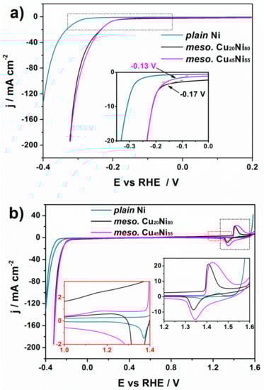 The catalytic activity toward HER of the Cu20Ni80 and Cu45Ni55 surface-mesostructured films was studied by recording polarization curves in 1 M KOH solution at a sweeping rate of 50 mV·s−1 at room temperature (Figure 8a). Note that current density is given per geometric area of the film exposed to the electrolyte. For comparison purposes, the behavior of a plain Ni film was used as a reference material. Since the onset potential can be determined from the deviation of the potential in the linear region [35], as indicated by an arrow in the inset of Figure 8a, one can conclude that the surface-mesostructured Cu45Ni55 showed lower onset potentials than those of plain Ni and surface-mesostructured Cu20Ni80 films. Polarization curves of plain Cu20Ni80 and Cu45Ni55 were also measured, as shown in Figure 9. Surface-mesostructured samples exhibited lower onset potentials, higher geometric current densities, and lower Tafel slopes than their plain counterparts (see Table 1). The enhanced HER performance of the mesostructured films was mainly due to their larger surface areas and the preferential segregation of Ni at the surface, as explained below.
