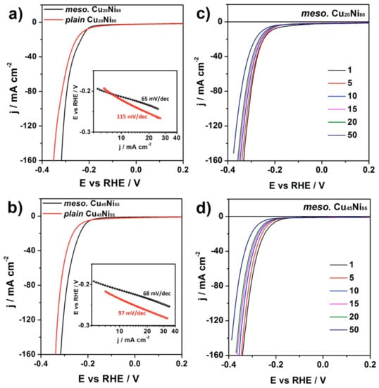 Cathodic-going linear sweep voltammetry curves for comparison between plain and surface-mesostructured (a) Cu20Ni80 and (b) Cu45Ni55, and the variation in HER current density as a function of the number of scans for (c) Cu20Ni80 and (d) Cu45Ni55. All curves were recorded in recorded in 1 M KOH at a scan rate of 50 mV·s−1 and 298 K. The insets in (a) and (b) show the Tafel slopes.